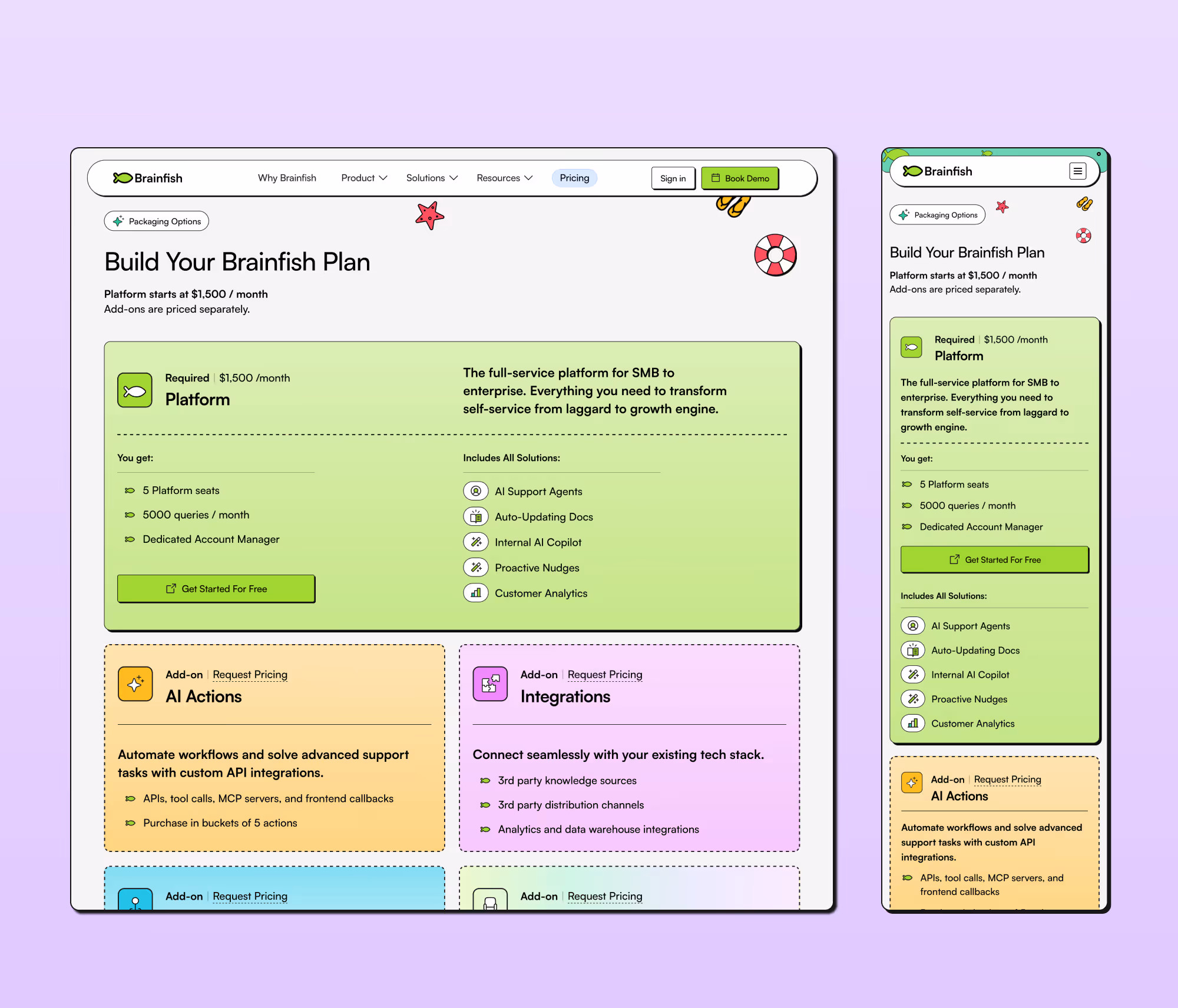 Our expansive website redesign covered 18+ pages, and involved dozens of unique graphics meant to seamlessly blend with the Brainfish brand. Through rigourous communication with the Brainfish team, we meticulously refined our ideas to deliver the depth and complexity of the Brainfish AI support product while maintaining a playful, aquatic theme throughout all the pages.