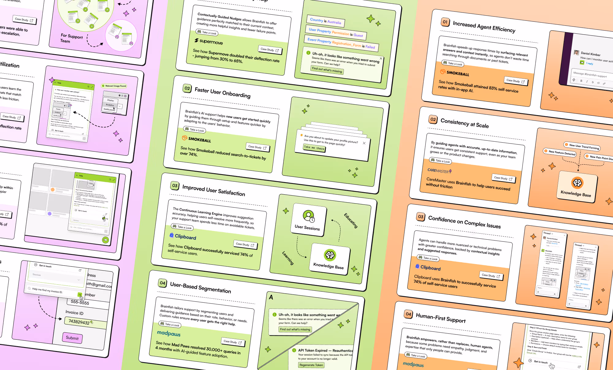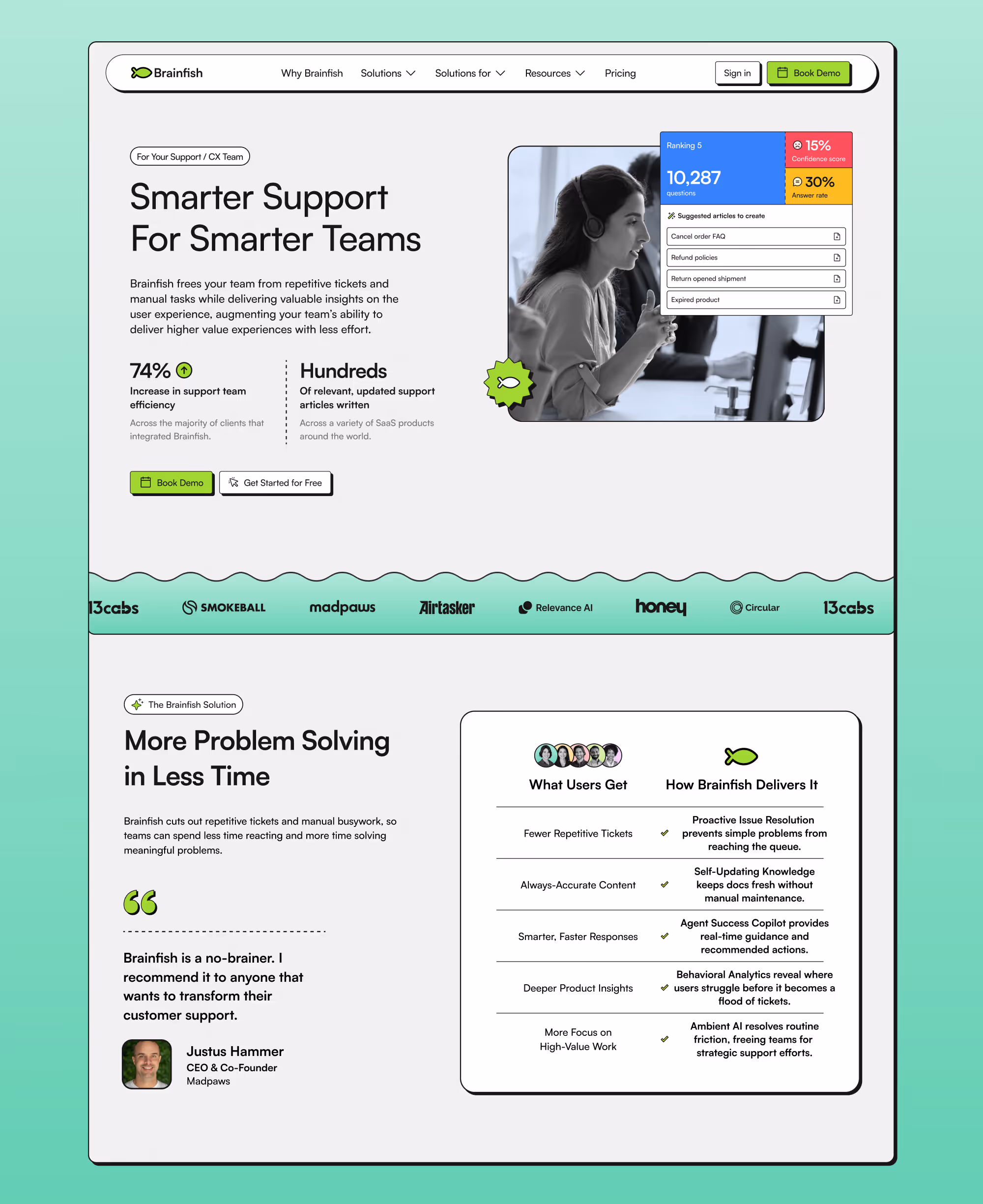 Just as Brainfish set out to redefine what AI support can look like, we set out to redefine what Brainfish can look like. Our challenge was to use Brainfish's established cartoon-inspired branding in a website capable of showing Brainfish as both a support solution and a product intelligence platform. The website needed to clearly communicate complex capabilities like self-updating knowledge, session analytics, and AI-driven workflows, all while appealing to product leaders, support teams, and enterprise buyers. Simple, yet sophisticated.