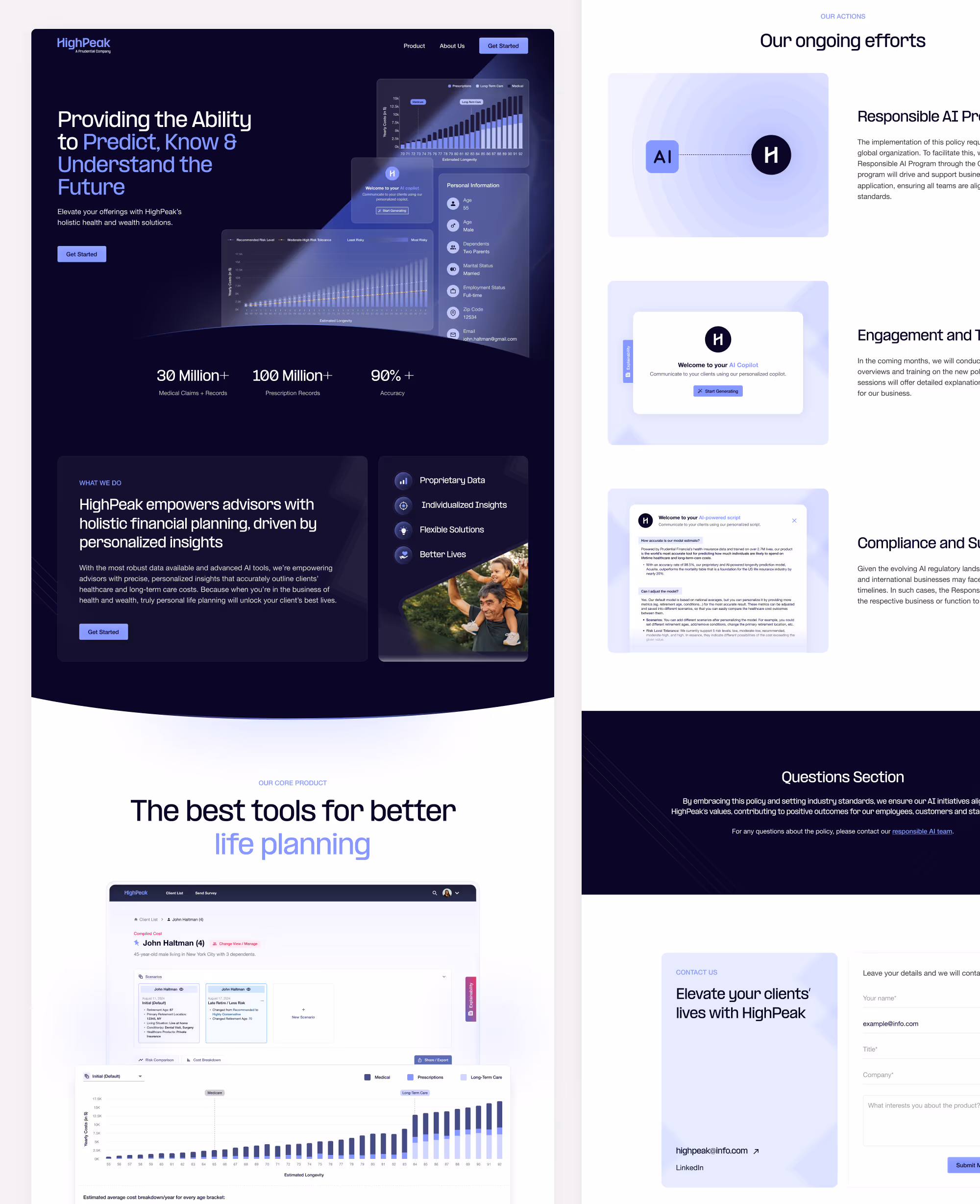 The website was a critical component of the project, serving as HighPeak's digital gateway for financial advisors. Designed and developed on Webflow, the site highlights HighPeak’s value proposition with clear messaging, strong visuals, and dynamic, data-rich sections. This ensures an engaging experience for advisors looking to explore how HighPeak’s platform can transform their approach to healthcare and wealth planning.