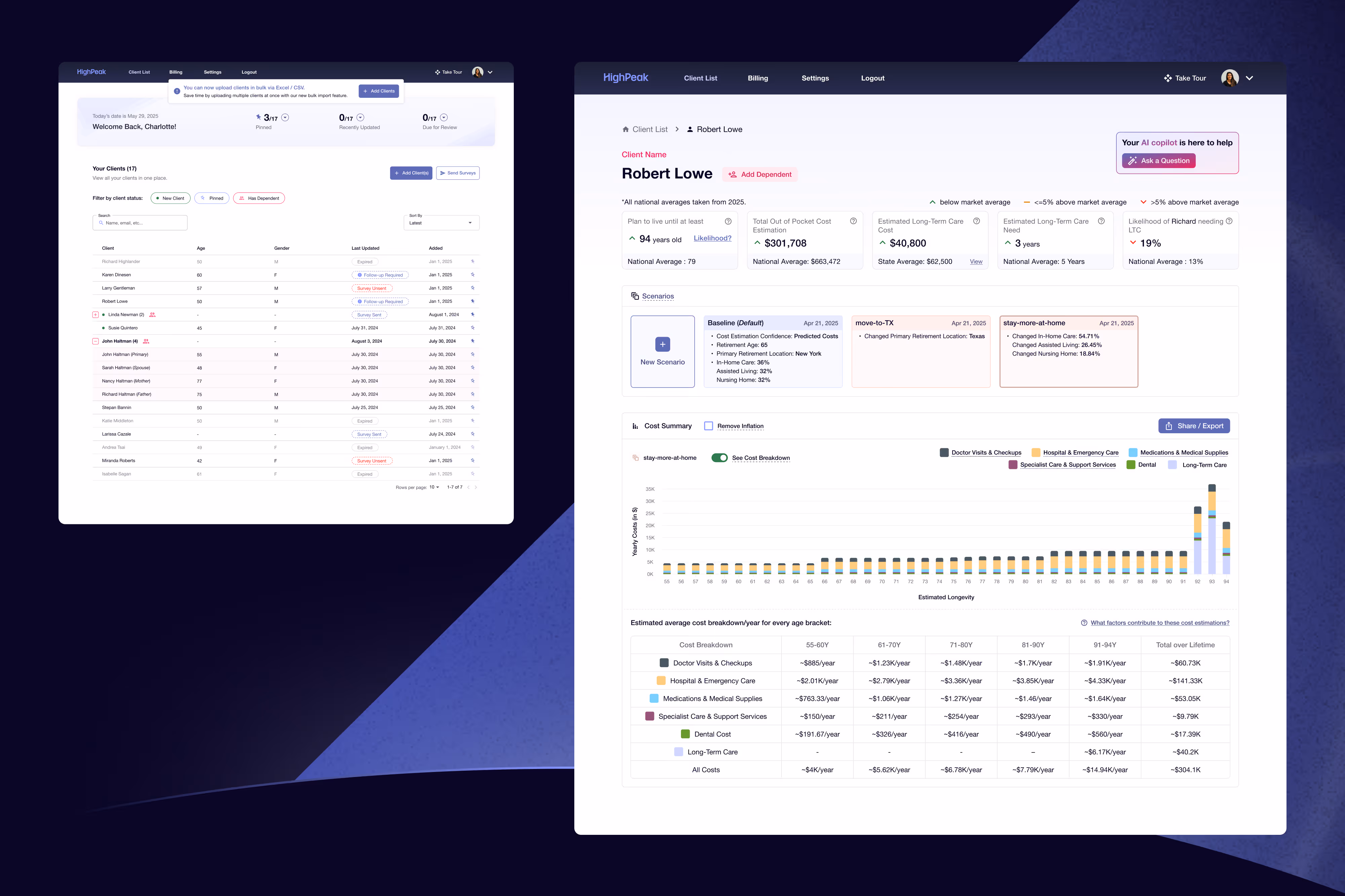 For the AI copilot product, we focused on intuitive design to simplify the presentation of complex healthcare data. By creating sleek, user-friendly interfaces, we ensured financial advisors could effortlessly navigate insights, evaluate risk levels, and project future costs. This usability focus empowers advisors to confidently incorporate HighPeak’s insights into their planning process.
