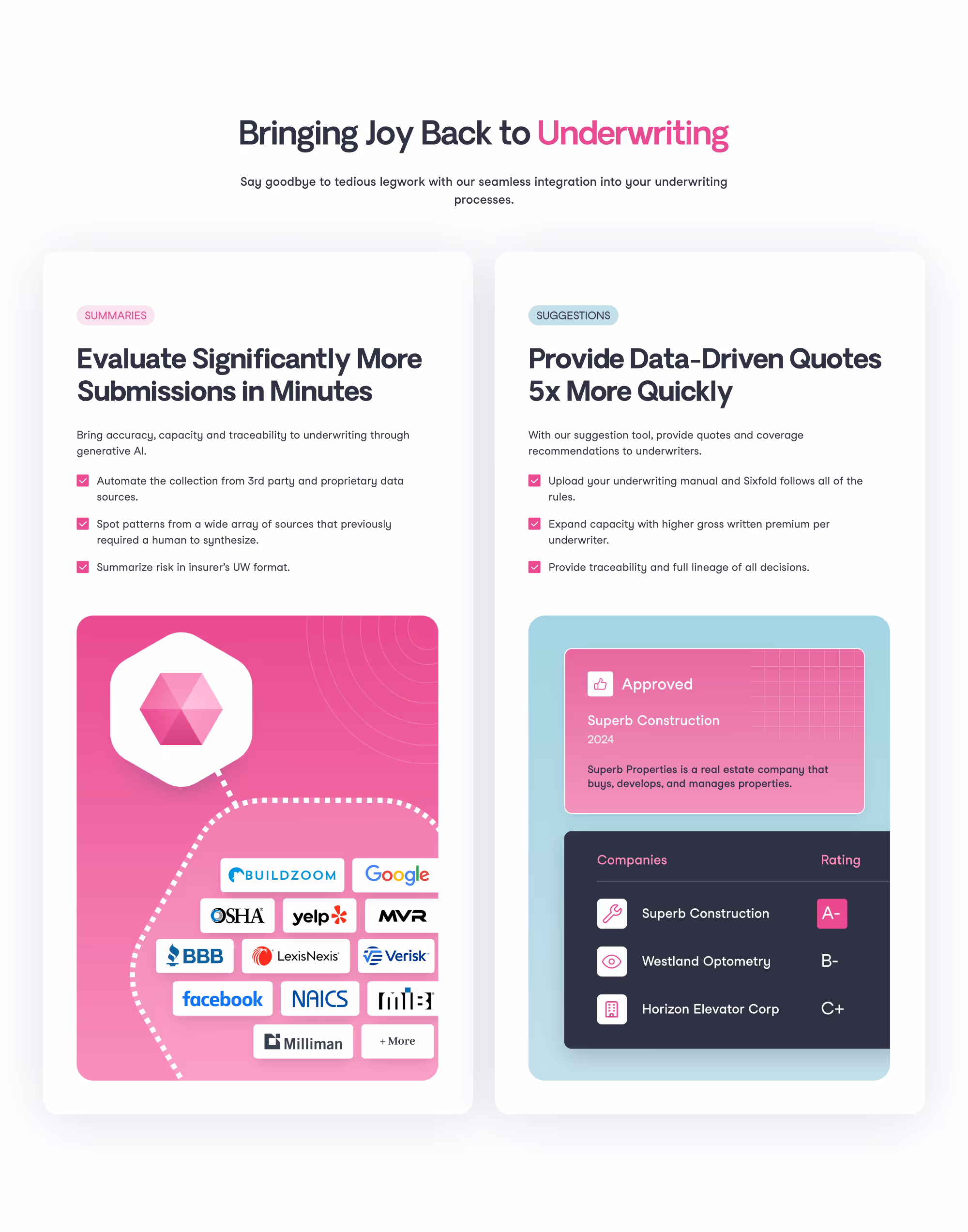 Since launching in mid-2023, Sixfold has raised $15M in Series A funding and grown its team from 3 to 18. Its AI-driven underwriting platform has improved accuracy to 94%, increased underwriting capacity 10x, accelerated data collection 2,000x, and cut submission-to-quote cycles from weeks to minutes. Sixfold was selected for Lloyd’s Lab and won the 2024 Zurich Innovation Championship as it expands into the UK and EU. Sixfold is poised for continued success and is excited usher users into the future of underwriting.