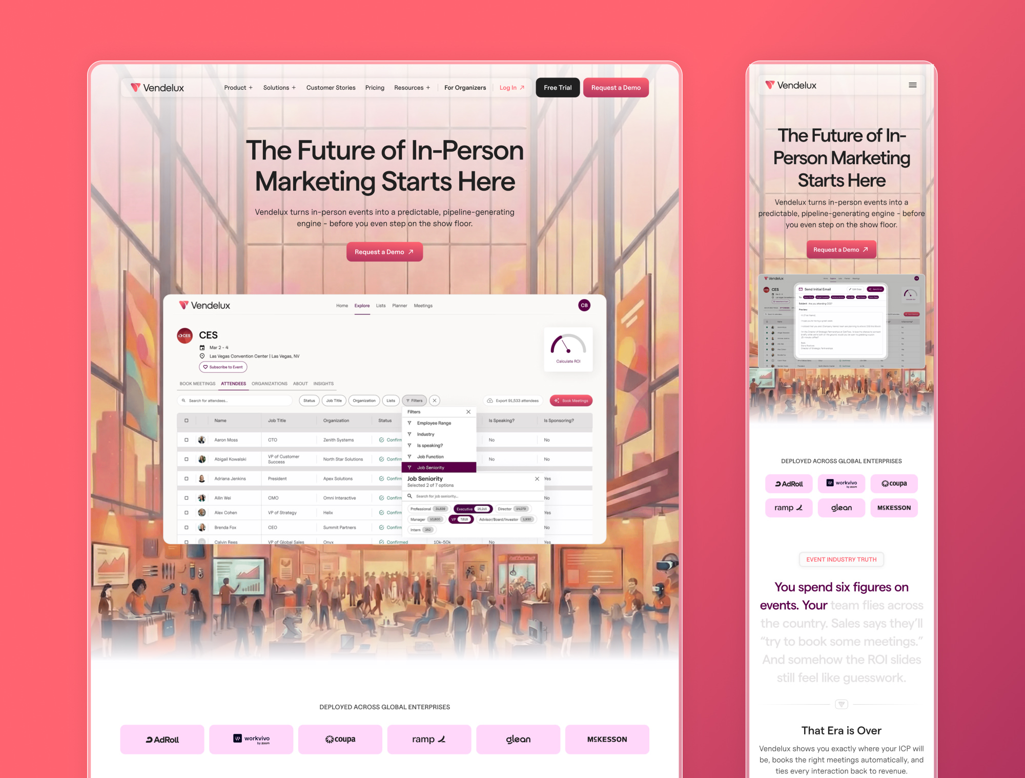 Vendelux’s new brand and website has put the company where it needs to be as it pursues its next round of funding. By establishing a unified design system, we provided a foundation for Vendelux to continue building on its product; and by thoroughly organizing the back-end infrastructure, we provided a foundation for the company to continue building out its website.