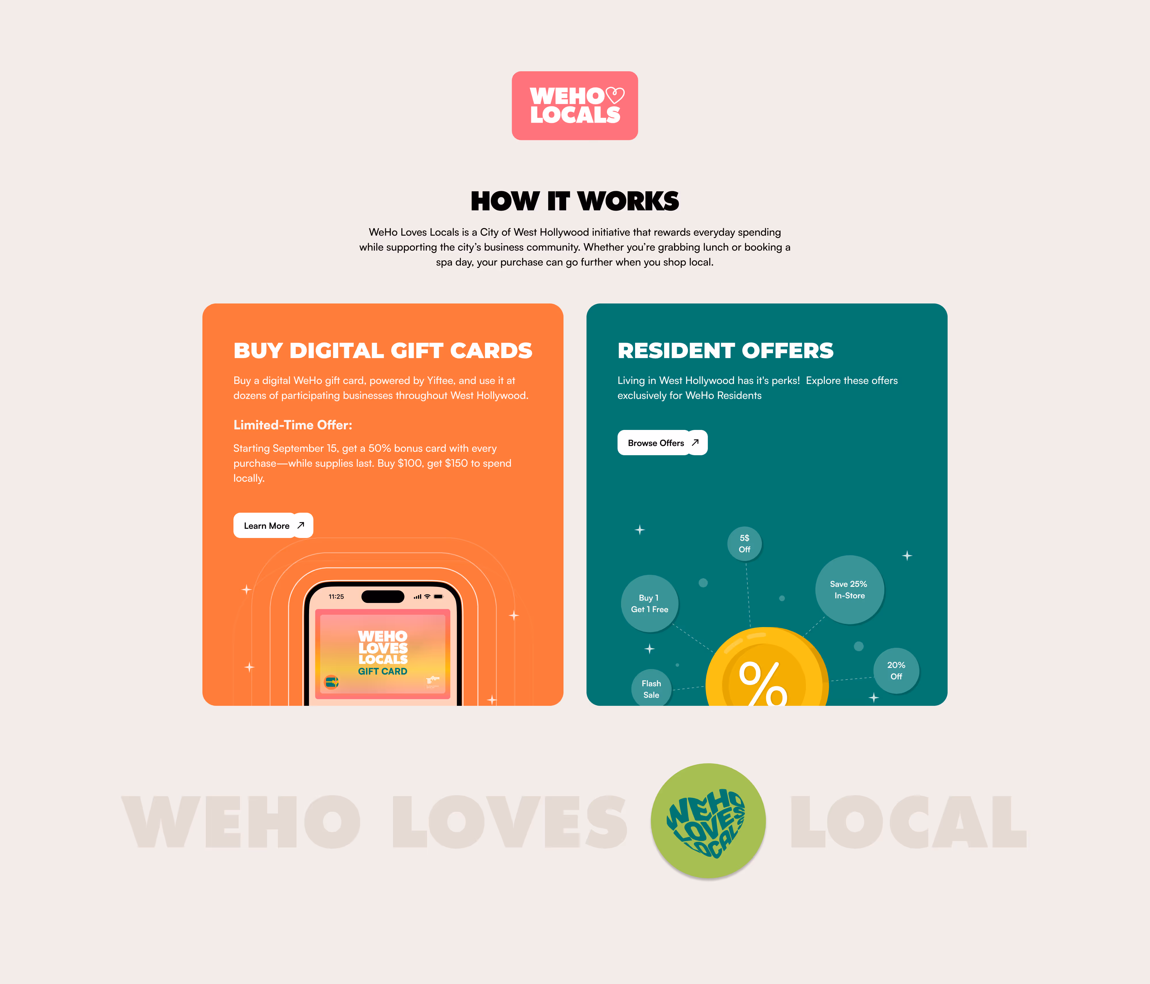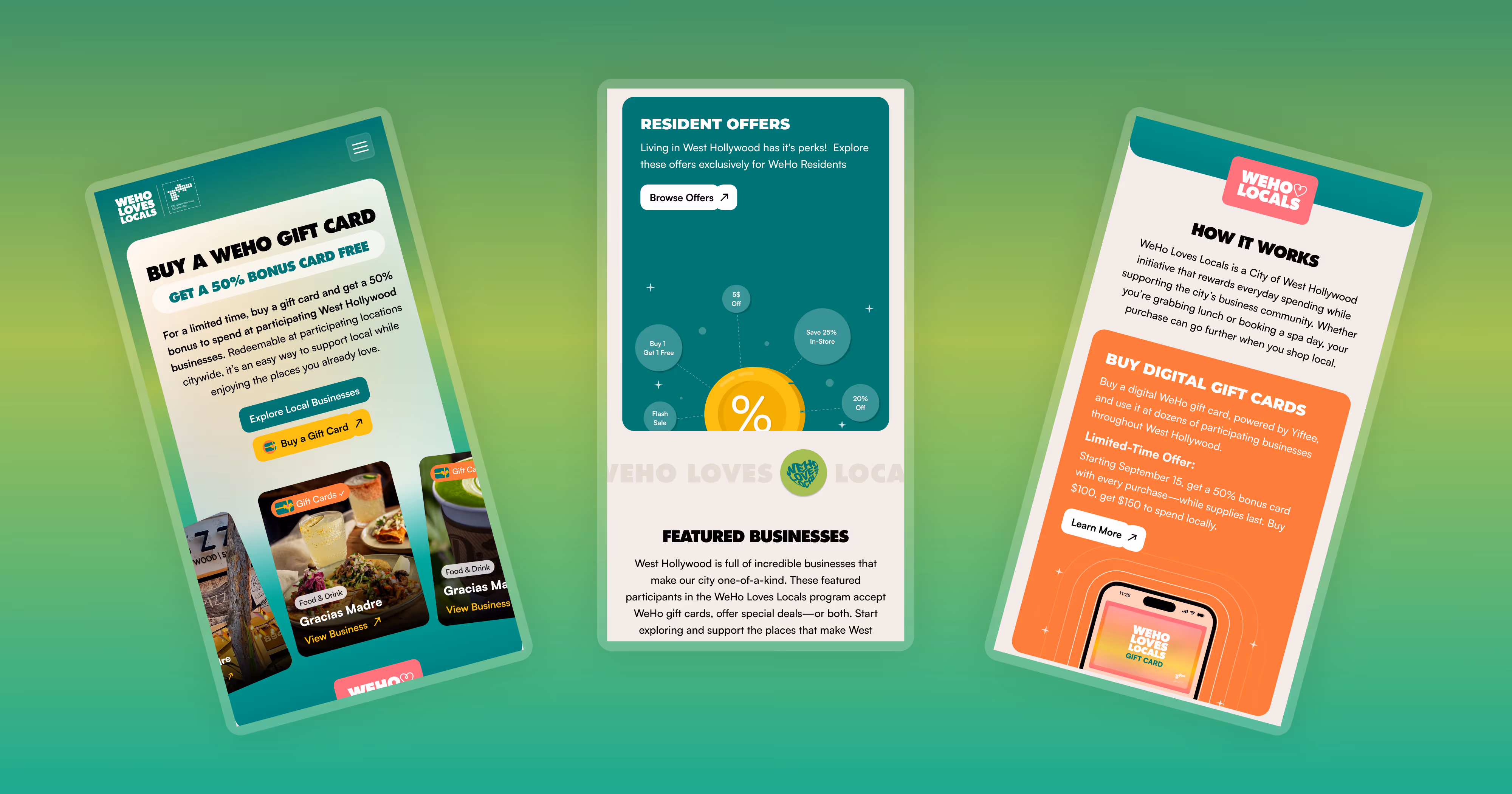 The redesigned site elevates WeHo Loves Locals from a static directory to an interactive platform that reinforces the partnership between the City of West Hollywood and Visit West Hollywood. By combining distinct branding, gift card incentives, curated offers, and an intuitive digital experience, the program now feels lively, engaging, and true to the spirit of the city. The result is a platform that not only gives neighborhood businesses the visibility and support they deserve, but also helps position West Hollywood as a vibrant community worth exploring.